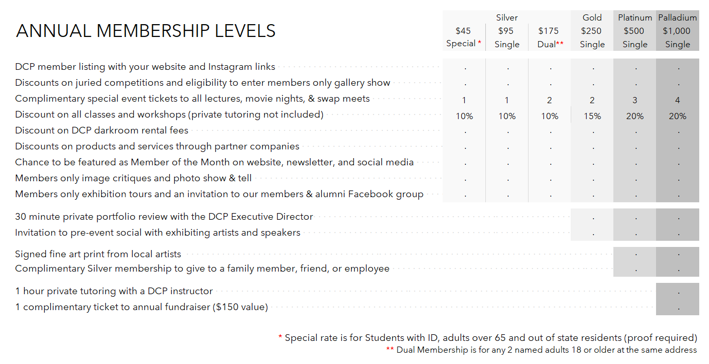 DCP was founded on the belief that people with an interest in photography need a place to call home. Online communities are broad but can lack the depth and personal interaction that brings life to any creative art. Becoming a member of DCP supports our programs, connects you to the local photographic community and offers you benefits like access to exclusive members only events, special discounts and the opportunity to exhibit your work. Membership also supports the DCP gallery, the only photography-only community exhibition space in the region.
